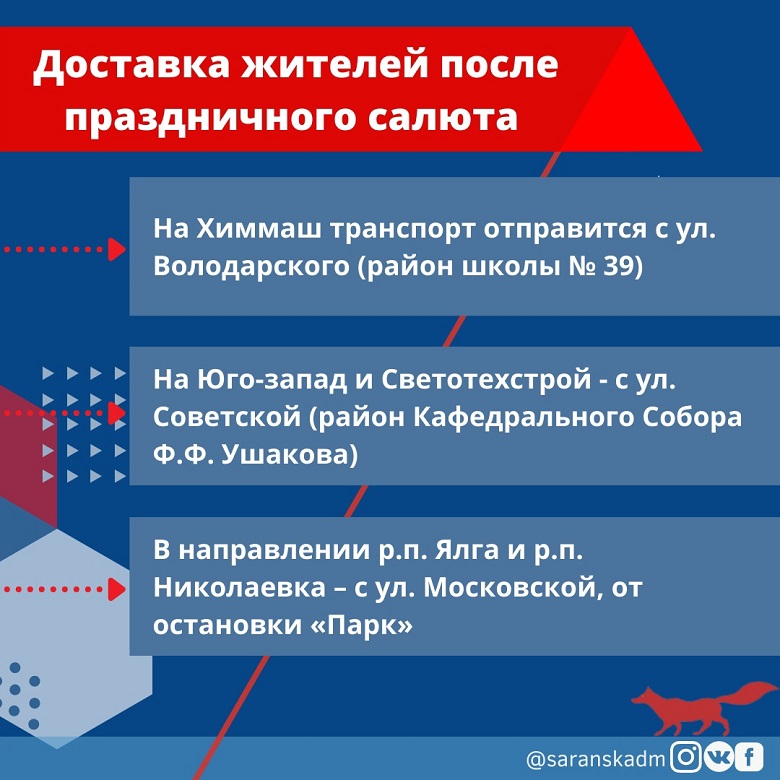 После новогоднего салюта на Советской площади жителей города развезут по микрорайонам. Организованная доставка горожан в микрорайоны Саранска будет осуществляться по четырем направлениям: Химмаш, Светотехстрой, Юго-Запад и направление р.п. Ялга и р.п. Николаевка. Оплата проезда осуществляется по действующему тарифу.