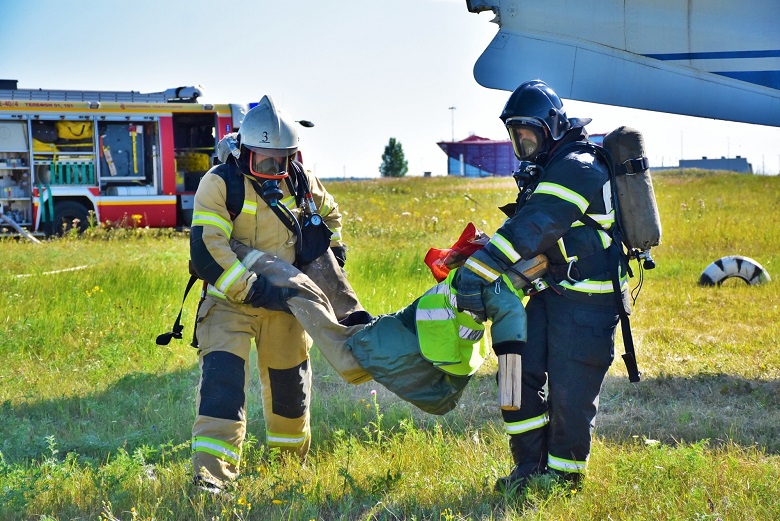 При помощи спасательных устройств условных пассажиров и экипаж эвакуировали из огненной ловушки и передали сотрудникам скорой медицинской помощи.