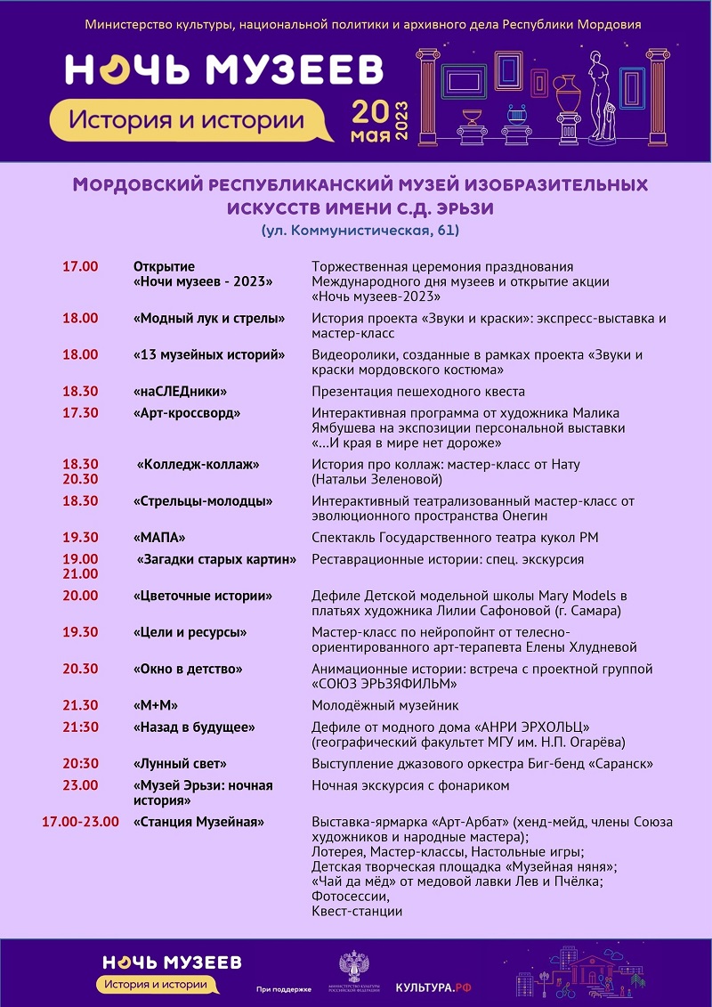 «Ночь музеев» в Саранске пройдет на шести основных площадках - музей изобразительных искусств им. С.Д. Эрьзи, Музей мордовской народной культуры, Краеведческий музей им. И.Д. Воронина, музейно-этнографический комплекс «Мордовское подворье», Мемориальный музей военного и трудового подвига 1941–1945 гг., литературный музей А.И. Полежаева.