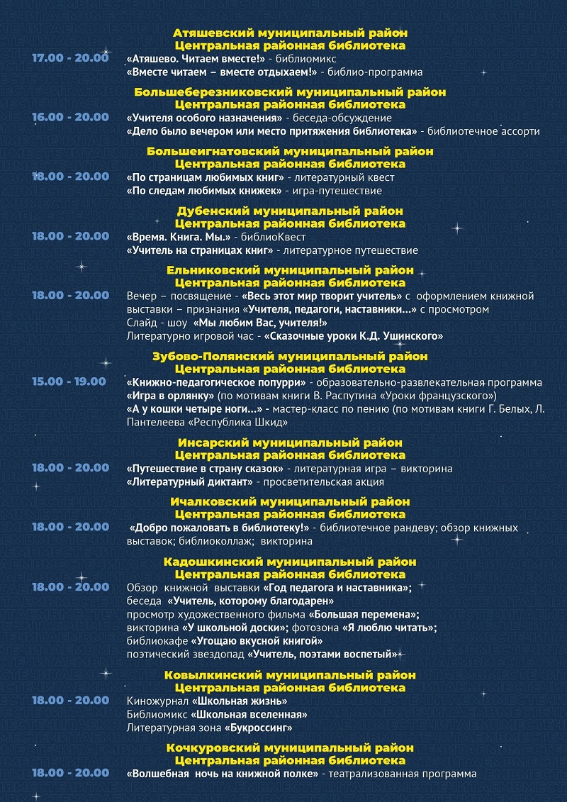 На «Библионочь» в Саранске приглашают Национальная библиотека им. А.С. Пушкина РМ, Мордовская республиканская детская библиотека, Мордовская республиканская специальная библиотека для слепых, Центральная городская библиотека для взрослых. Также к акции присоединятся библиотеки в муниципальных районах республики.