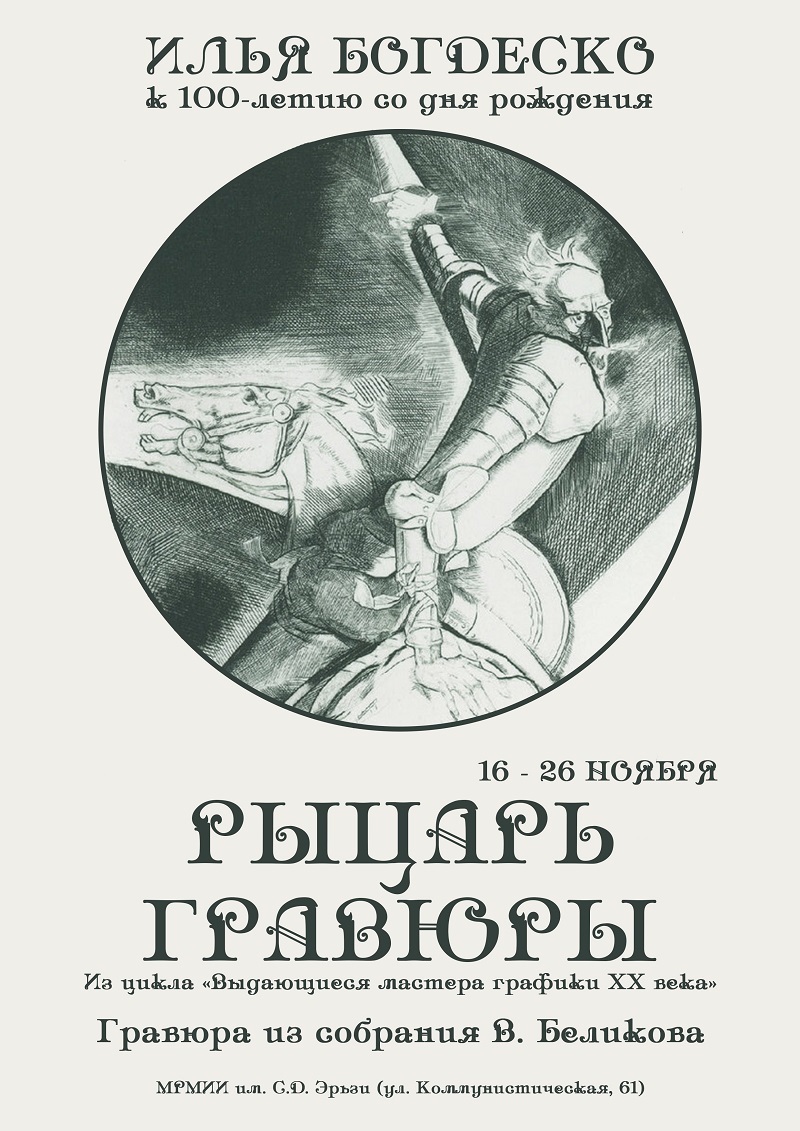 16 ноября в Мордовском республиканском музее изобразительных искусств им. С.Д. Эрьзи откроется юбилейная выставка молдавского графика Ильи Богдеско (1923-2010) «Рыцарь гравюры». Она посвящена 100-летию со дня рождения известного художника.