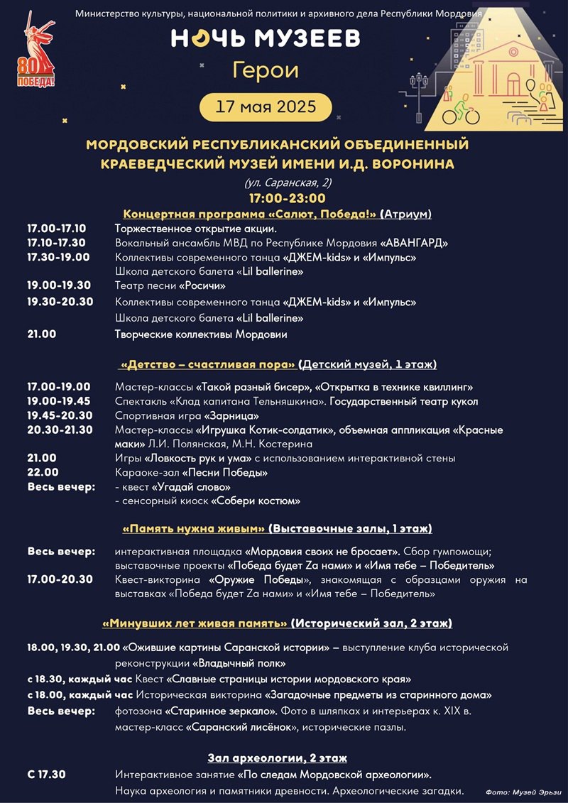 В Саранске гостей ждут Музей Эрьзи, Краеведческий музей им. И.Д. Воронина, музейно-этнографический комплекс «Мордовское подворье». У жителей и гостей Саранска до глубоко вечера будет уникальная возможность посетить музейное пространство и познакомиться с экспозициями, принять участие в различных мероприятиях.
