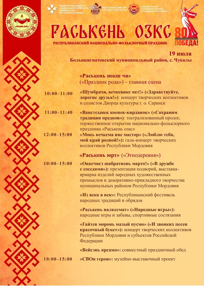 Гостей ждут фольклорно-обрядовые представления, концерт профессиональных и самодеятельных творческих коллективов из Мордовии и других регионов нашей страны.