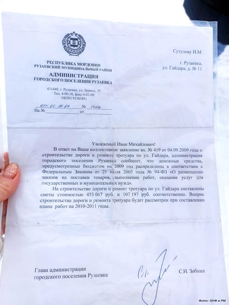 «30 лет мы боремся за дорогу». Так начинается обращение жительницы Рузаевки, поступившее на прямую линию Президента России в декабре 2024 года. Перед тем, как обратиться к главе государства, люди десятилетиями добивались ремонта дороги в городской администрации. В 2009 году даже была составлена смета, однако на этом вопрос и застопорился.